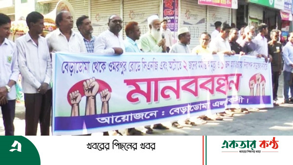 একতার কণ্ঠঃ টাঙ্গাইল পৌরসভার বেড়াডোমা এলাকায় টাঙ্গাইল-বাঘিল আঞ্চলিক সড়কে দুর্ঘটনায় চলতি সপ্তাহে দুজনের মৃত্যুর পর ঐ সড়কে গতি রোধকের দাবীতে মানববন্ধন করেছে এলাকাবাসী।